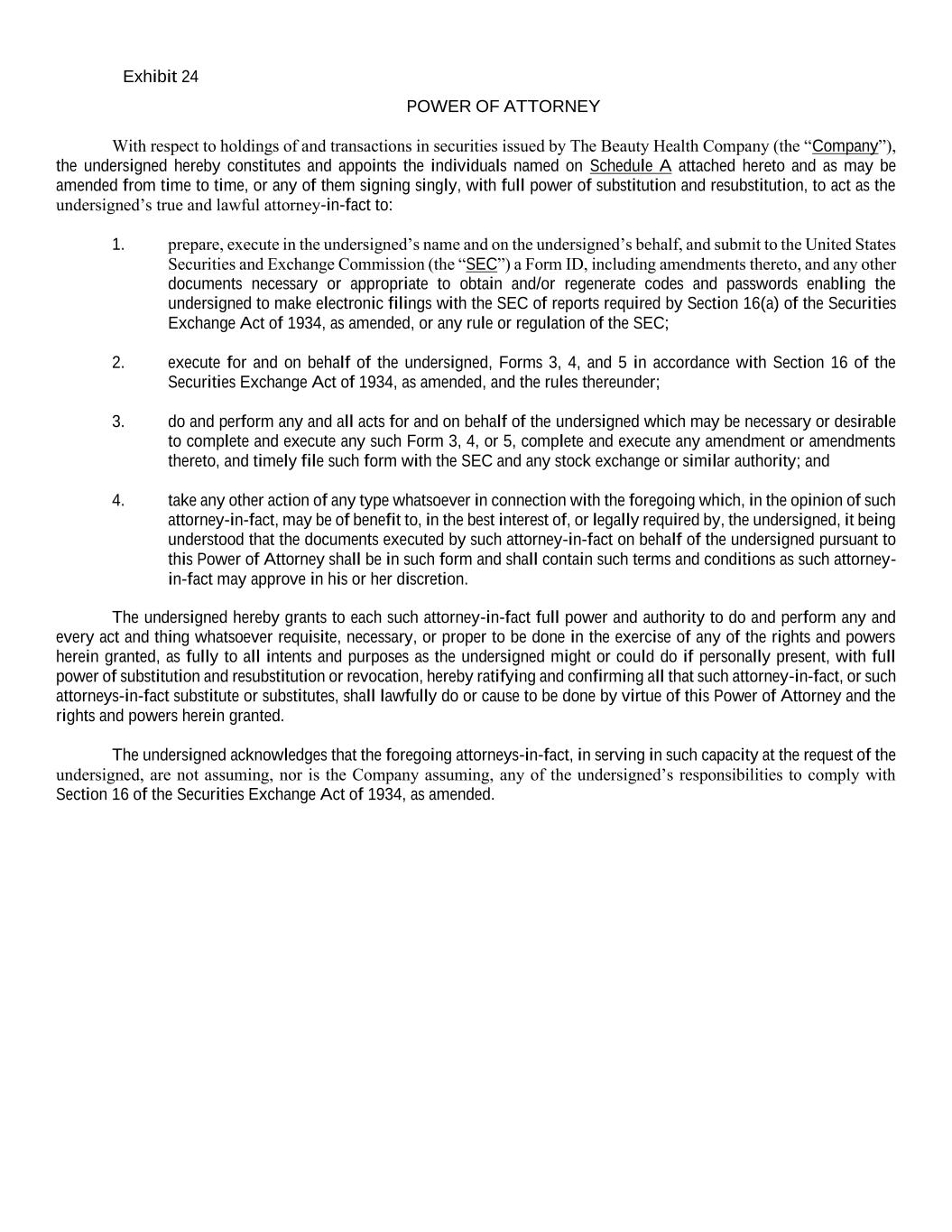 Exhibit 24 POWER OF ATTORNEY With respect to holdings of and transactions in securities issued by The Beauty Health Company (the “Company”), the undersigned hereby constitutes and appoints the individuals named on Schedule A attached hereto and as may be amended from time to time, or any of them signing singly, with full power of substitution and resubstitution, to act as the undersigned’s true and lawful attorney-in-fact to: 1. prepare, execute in the undersigned’s name and on the undersigned’s behalf, and submit to the United States Securities and Exchange Commission (the “SEC”) a Form ID, including amendments thereto, and any other documents necessary or appropriate to obtain and/or regenerate codes and passwords enabling the undersigned to make electronic filings with the SEC of reports required by Section 16(a) of the Securities Exchange Act of 1934, as amended, or any rule or regulation of the SEC; 2. execute for and on behalf of the undersigned, Forms 3, 4, and 5 in accordance with Section 16 of the Securities Exchange Act of 1934, as amended, and the rules thereunder; 3. do and perform any and all acts for and on behalf of the undersigned which may be necessary or desirable to complete and execute any such Form 3, 4, or 5, complete and execute any amendment or amendments thereto, and timely file such form with the SEC and any stock exchange or similar authority; and 4. take any other action of any type whatsoever in connection with the foregoing which, in the opinion of such attorney-in-fact, may be of benefit to, in the best interest of, or legally required by, the undersigned, it being understood that the documents executed by such attorney-in-fact on behalf of the undersigned pursuant to this Power of Attorney shall be in such form and shall contain such terms and conditions as such attorney- in-fact may approve in his or her discretion. The undersigned hereby grants to each such attorney-in-fact full power and authority to do and perform any and every act and thing whatsoever requisite, necessary, or proper to be done in the exercise of any of the rights and powers herein granted, as fully to all intents and purposes as the undersigned might or could do if personally present, with full power of substitution and resubstitution or revocation, hereby ratifying and confirming all that such attorney-in-fact, or such attorneys-in-fact substitute or substitutes, shall lawfully do or cause to be done by virtue of this Power of Attorney and the rights and powers herein granted. The undersigned acknowledges that the foregoing attorneys-in-fact, in serving in such capacity at the request of the undersigned, are not assuming, nor is the Company assuming, any of the undersigned’s responsibilities to comply with Section 16 of the Securities Exchange Act of 1934, as amended.